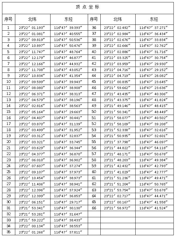 汕头市莱福建设有限公司拟在汕头市新津河口东侧建设汕头市东部城市经济带东海岸新城行政服务中心项目,拟使用海域面积42.0323公顷,为填海用海(界至范围详见下表),项目用海期限40年。有关事宜通告如下: