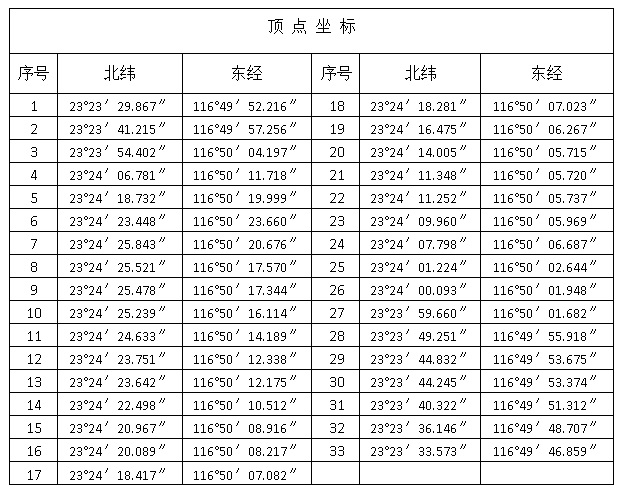 汕头市溪美建设有限公司拟在汕头市新津河口东侧建设汕头市东部城市经济带塔岗围片区滨海大道岸线景观带项目,拟使用海域面积34.51公顷,为填海用海(界至范围详见下表),项目用海期限40年。有关事宜通告如下: