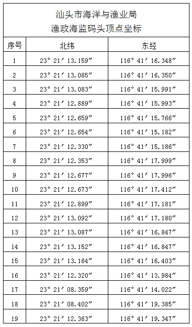 汕头市海洋与渔业局拟申请办理渔政海监码头海域使用权证书,码头位于汕头市海滨路中段,项目所在地中心坐标:N23°21'13.156",E116°41'16.356"。项目申请使用海域面积1.9877公顷,其中透水构筑物用海面积0.1312公顷,港池用海面积1.8565公顷,申请用海期限40年(具体用海范围详见我局网站www.sthyyyj.gov.cn)。有关事宜通告如下: