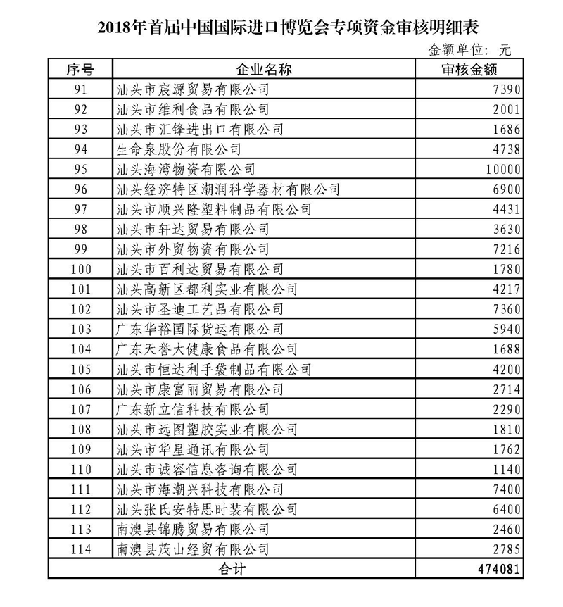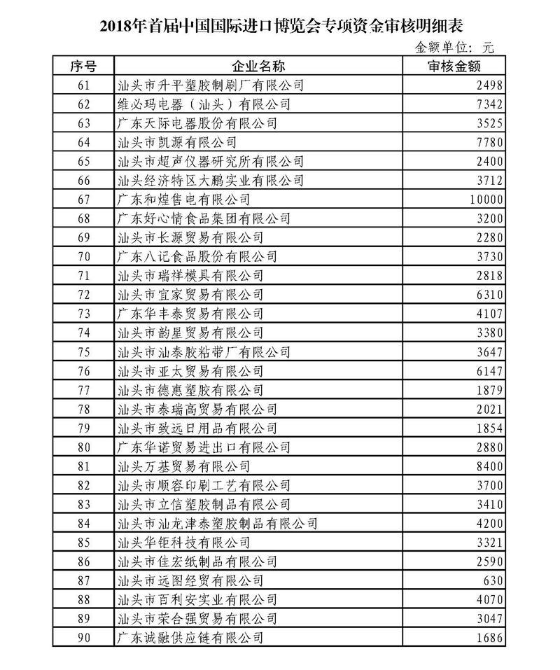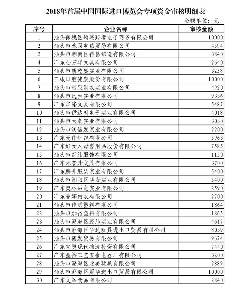 根据《关于我市11月组团赴上海参加首届中国国际进口博览会有关事项的补充意见请示》(汕商务〔2018〕71号)及市政府领导关于该请示的批示精神(综三20180281),我局近期组织企业申报2018年首届中国国际进口博览会专项资金。经评审、审核,现将结果予以公示,公示时间:2018年12月13日-12月19日(共5个工作日)。如对分配名单有异议,请以书面形式向汕头市商务局(贸易促进与管理科)反映情况。以个人名义反映情况的,请提供真实姓名、身份证复印件、联系方式和反映的具体事项以及确凿的证明材料;以单位名义反映情况的,请提供真实单位名称(加盖公章)、联系人、联系方式和反映的具体事项以及确凿的证明材料。凡匿名或假冒他人姓名反映问题的,或未提供可查证的线索,或逾期提供证据材料的,不予受理。