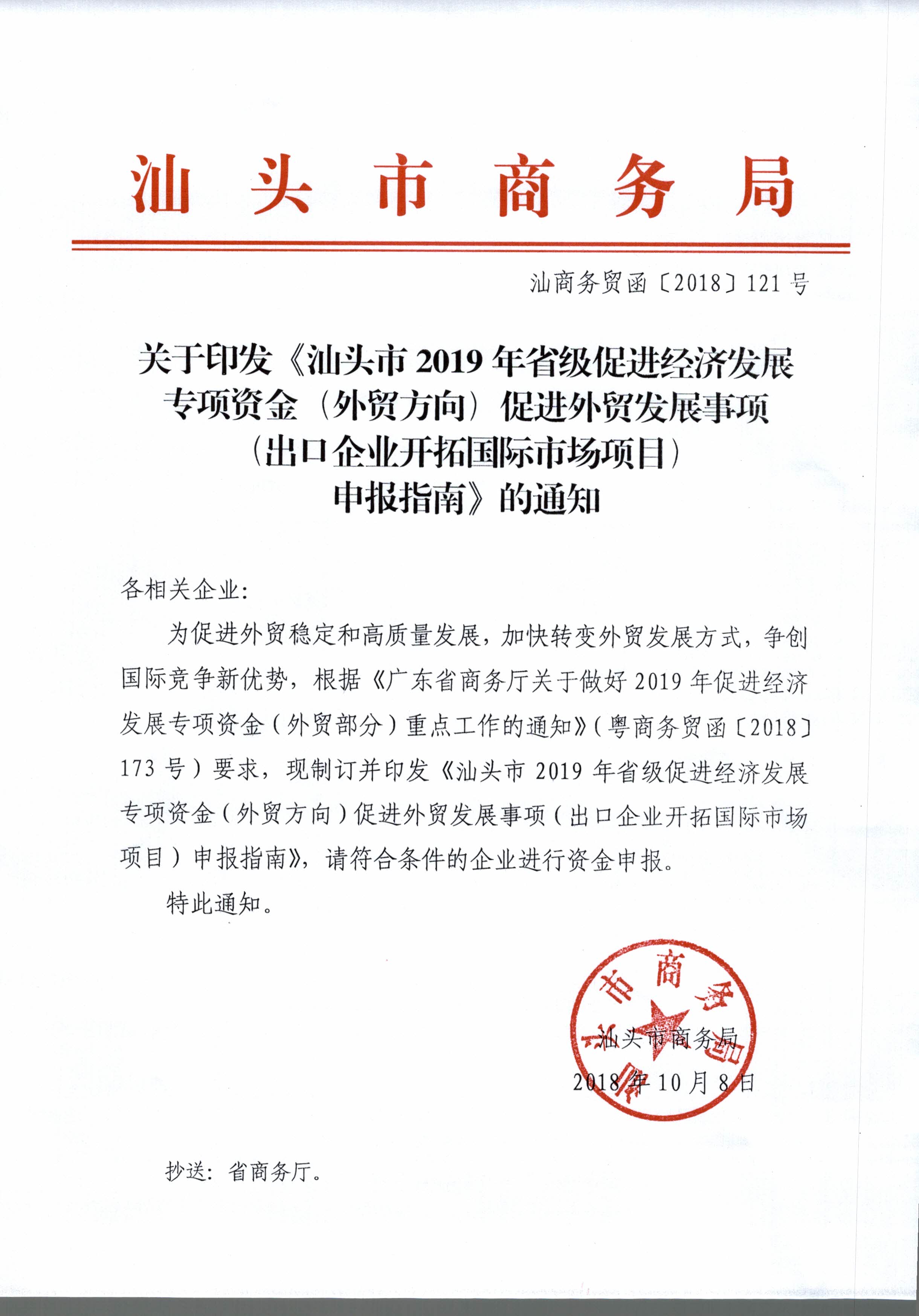 附件:121,关于印发《汕头市2019年省级促进经济发展专项资金(外贸方向)促进外贸发展事项(出口企业开拓国际市场项目)申报指南》的通知